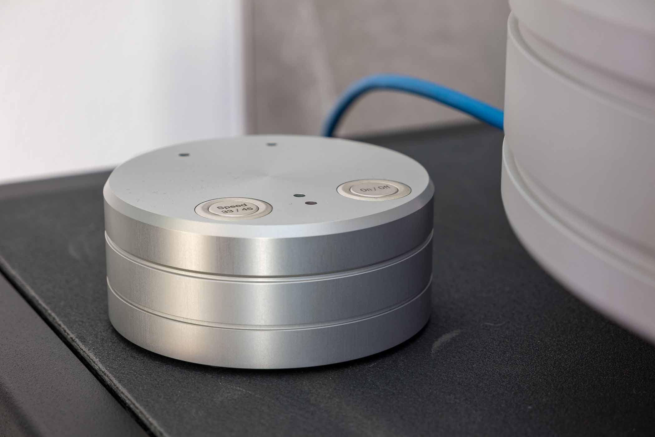 - RPM-regulated double belt drive with speed fine adjustment for the subplatter